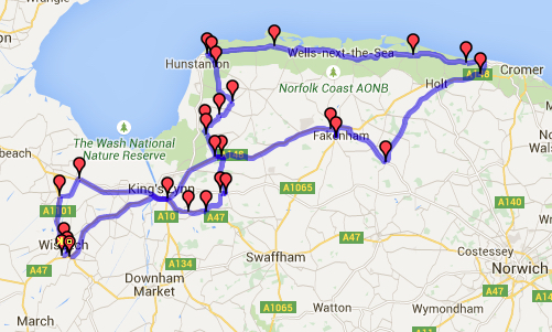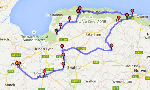 The route then follows the A149 to Weybourne, where we turn Right onto the Holt Road. This brings up to Emcy Garden Centre (another planned stop). From there it is back to the A148, then the B1110 and B1145 to the edge of Kings Lynn. Follow the A149 back to the Hardwick roundabout and rejoin the A47 back to Wisbech.