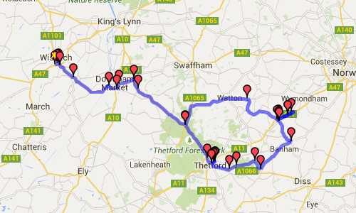Starting from the Tiger Factory, Head towards Downham Market, then towards Swaffham. However we will turn back towards Kings Lynn to a meeting point at the Carpenters Arms in East Winch.