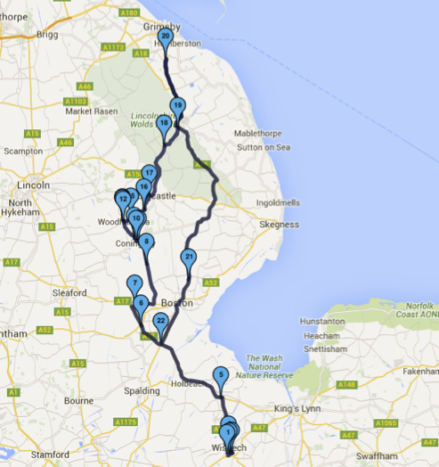 Take the B1192 towards Conningsby and we will have a rest stop at the Bubblecar Musuem where you can get a drink and have a (quick) wander round. Then up to Woodhall Spa, Horncastle, Louth and onto the lunch stop (Jug and Kettle pub).