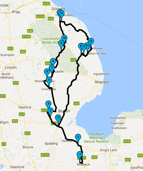 For the return leg (Head back down towards Louth on the same road, then take the A16 all the way to the end point.